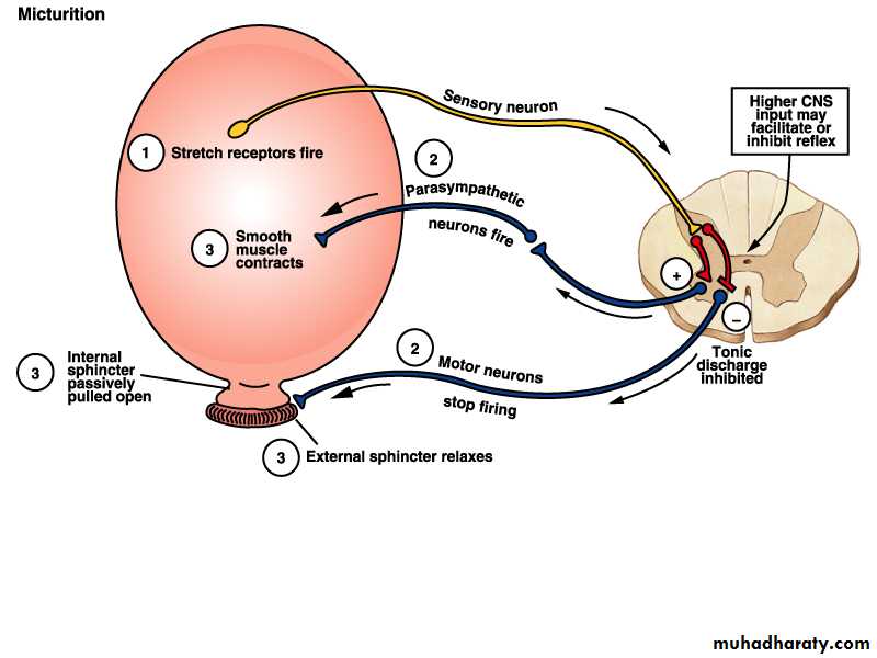 As the bladder fill, stretches the bladder wall, stimulating stretch receptor in the bladder neck. (The first urge to void is felt at a bladder volume of about 150 ml, and a marked sense of fullness at about 300-400 ml). Sensory signals are conducted to the sacral segments of the spinal cord through pelvic nerves and then back again to bladder through the parasympathetic fibers in the same nerves initiating micturition contraction of the detrusor muscles. Once a micturition reflex begins the high pressure inside the bladder, forces the bladder neck to open against its tonic contraction. Stretching the bladder neck exacerbates the intensity of the micturition reflex. This reflex passes to sacral portion of spinal cord and then back through pudendal nerve to the external sphincter to inhibit it.