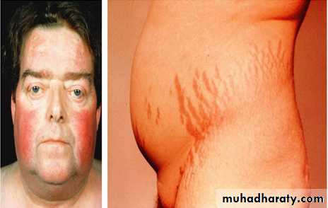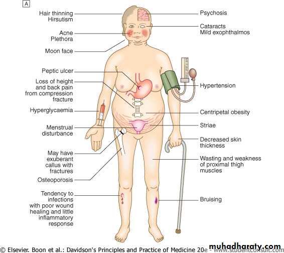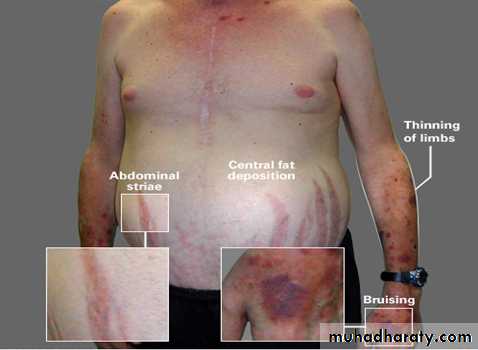 Cushing's syndrome is a syndrome that reflects excessive tissue exposure to cortisol.Most common cause is iatrogenic; prolonged administration of synthetic glucocorticoids