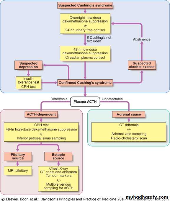B-What is the cause of the Cushing's syndrome?1-Basal ACTH levels; are normal or elevated in Cushing's disease and the ectopic ACTH syndrome and are suppressed in adrenal Cushing's syndrome.