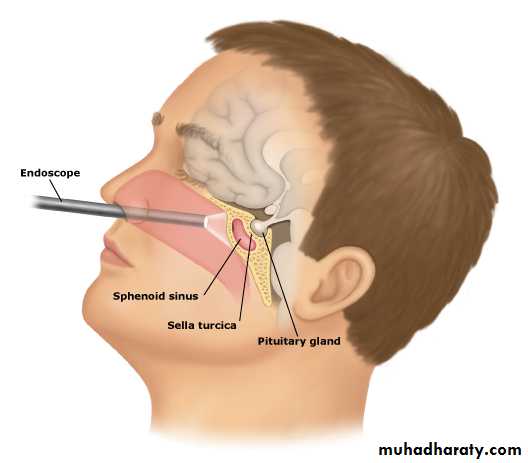 1- Medical therapy; given for a few weeks prior to operation. (inhibit corticosteroid biosynthesis) including metyrapone, aminoglutethimide and ketoconazole.2- Cushing's disease; Trans-sphenoidal surgery with selective removal of the adenoma is the treatment of choice.
