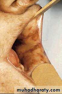 PigmentationSun-exposed areas Pressure areas, e.g. elbows, kneesPalmar creases, knucklesMucous membranesConjunctivae