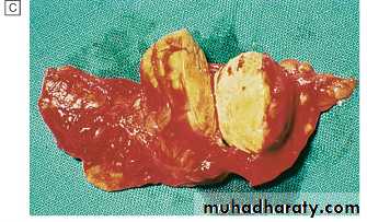 • Conn's adenoma. A-CT scan of left adrenal adenoma (arrow). B- 131Iodo-norcholesterol scan showing uptake in left adrenal adenoma (arrow). C-The tumour is 'canary yellow' because of intracellular lipid accumulation.