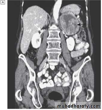 CT scan of abdomen showing large left adrenal phaeochromocytoma. The normal right adrenal (white arrow) contrasts with the large heterogeneous phaeochromocytoma arising from the left adrenal gland (black arrows).