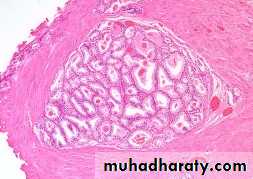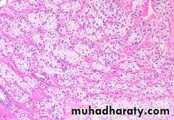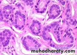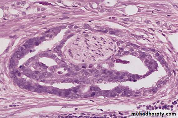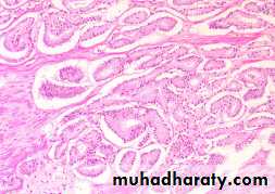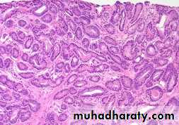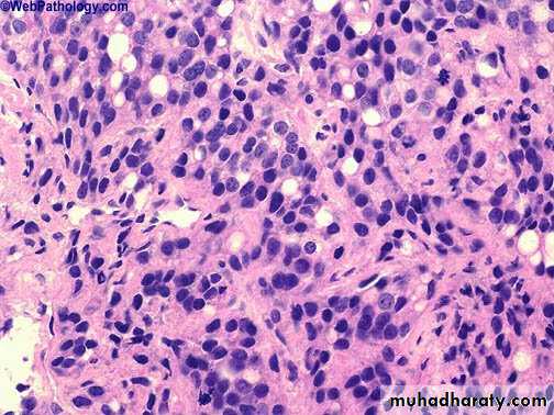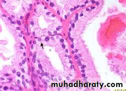 Microscopically:- most Ca prostate are adenocarcinomas with variable degree of differentiation. They originate from intraductal dysplastic foci termed prostatic intra epithelial neoplasia (PIN) which is a premalignant state in which the prostatic ducts lined by cytologically a typical luminal cells and a concomitant diminution in the number of the basal cells.