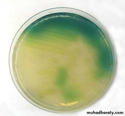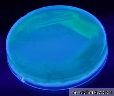 3- its form smooth, round colonies with fluorescent greenish color or non fluorescent bluish color (pyocyanine) which diffuse into the agar (characteristic feature). Other species produce dark red color pigment (pyorubin or black pigment which is pyomelanin.