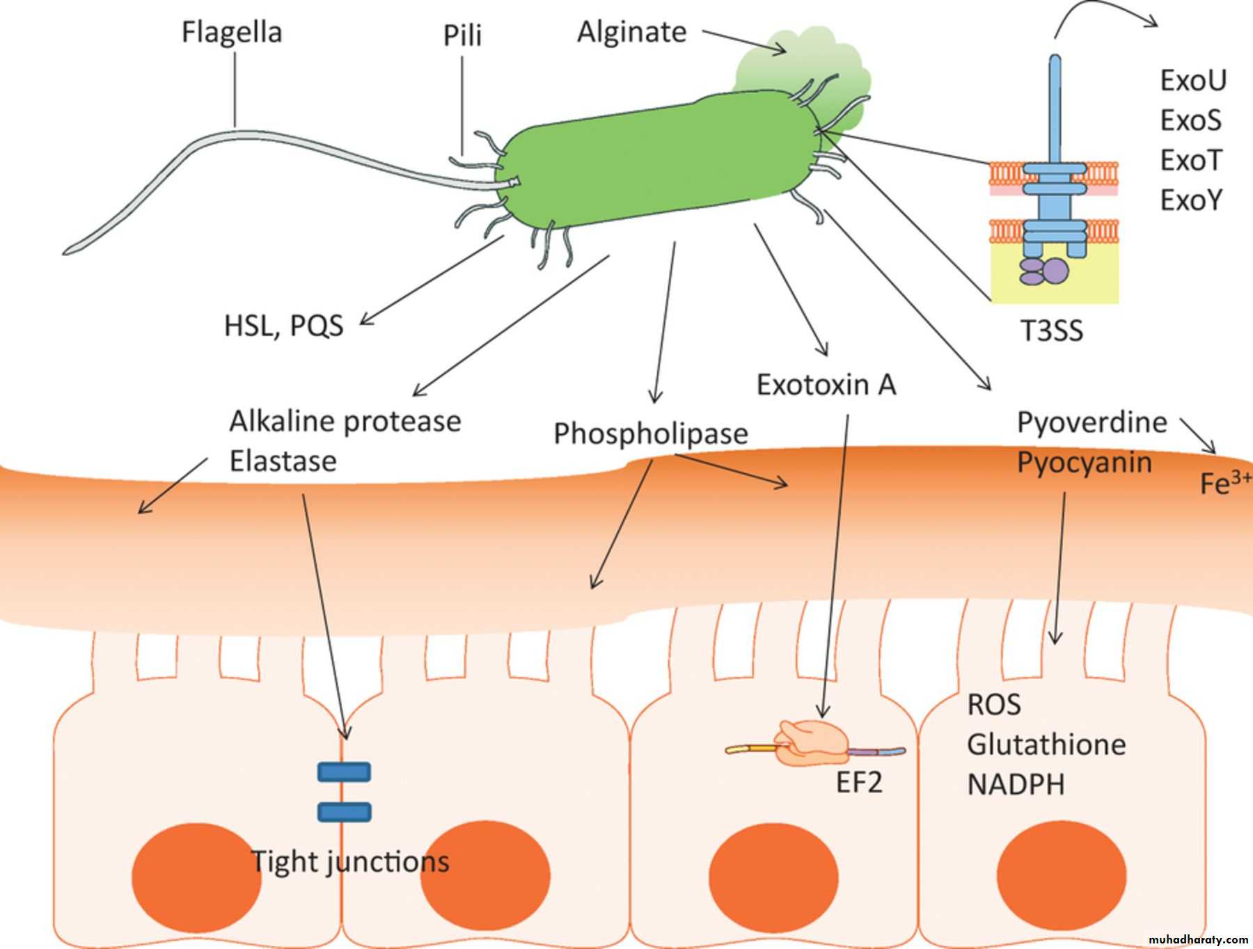 1- pili promote attachment to host epithelial cells2- exopolysaccharide (alginate)responsible for mucoid colonies and antiphagocytic factor.