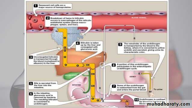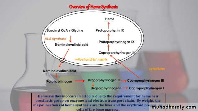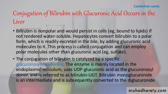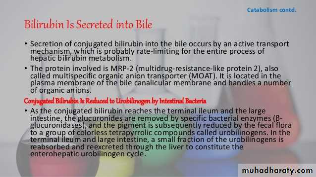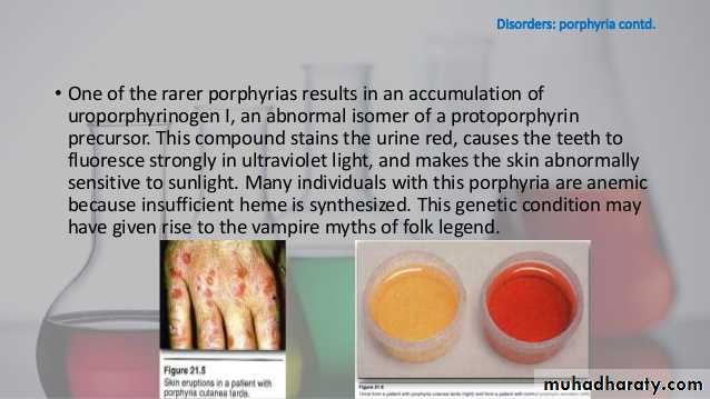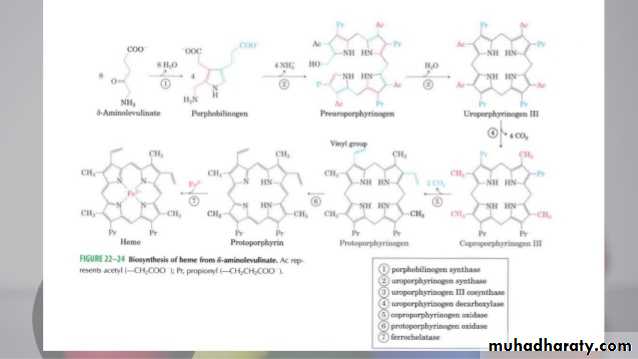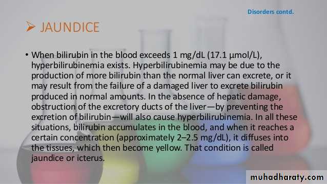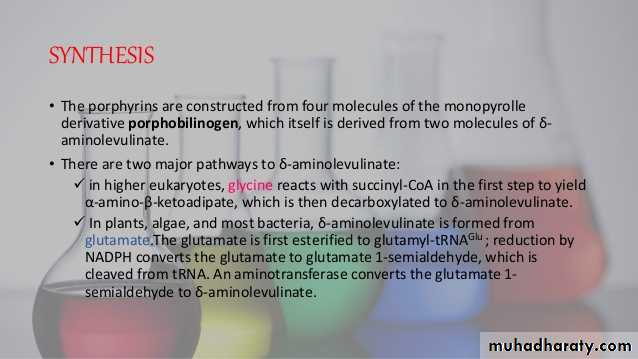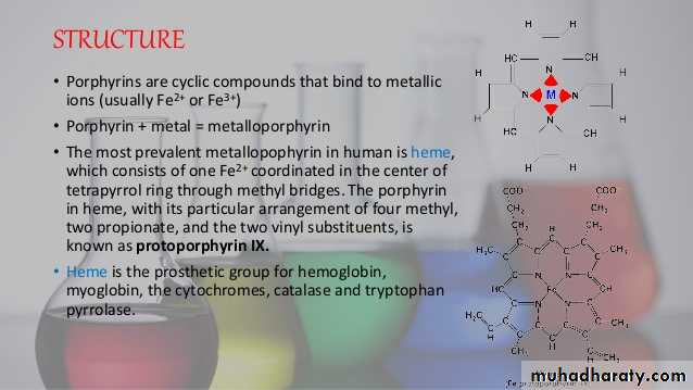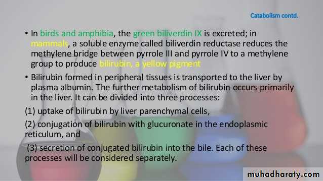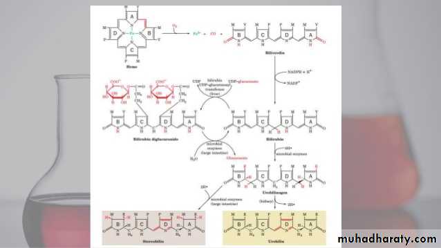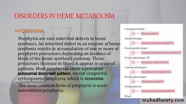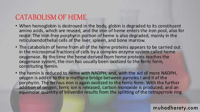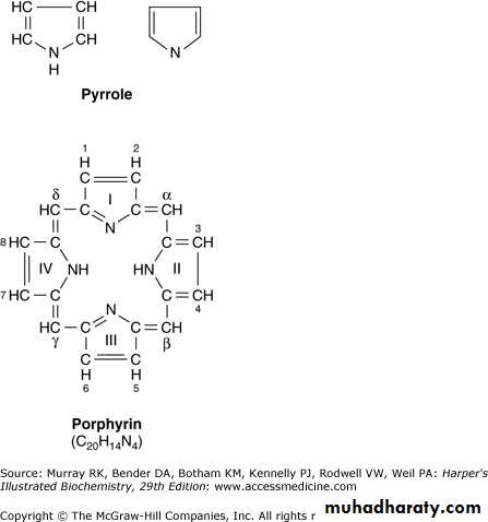 Biomedical importanceThe biochemistry of the porphyrins and of the bile pigments are closely related topics. Heme is synthesized from porphyrins and iron, and the products of degradation of heme are the bile pigments and iron. The biochemistry of the porphyrins and of heme is basic to understanding the varied functions of hemoproteins, and the porphyrias, a group of diseases caused by abnormalities in the pathway of porphyrin biosynthesis. A much more common clinical condition is jaundice, a consequence of an elevated level of plasma bilirubin, due either to overproduction of bilirubin or to failure of its excretion. Jaundice occurs in numerous diseases ranging from hemolytic anemias to viral hepatitis and to cancer of the pancreas.