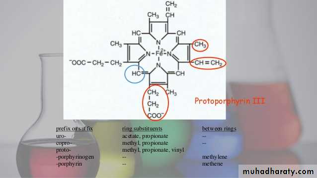 Porphyrins are cyclic compounds formed by the linkage of four pyrrole rings through methyne (ÓHC—) bridges (Figure 31–1). In the naturally occurring porphyrins, various side chains replace the eight numbered hydrogen atoms of the pyrroles. Figure 31–2 shows a shorthand representation of these substitutions. Figures 31–3 and 31–4 illustrate these substituents on selected porphyrins.