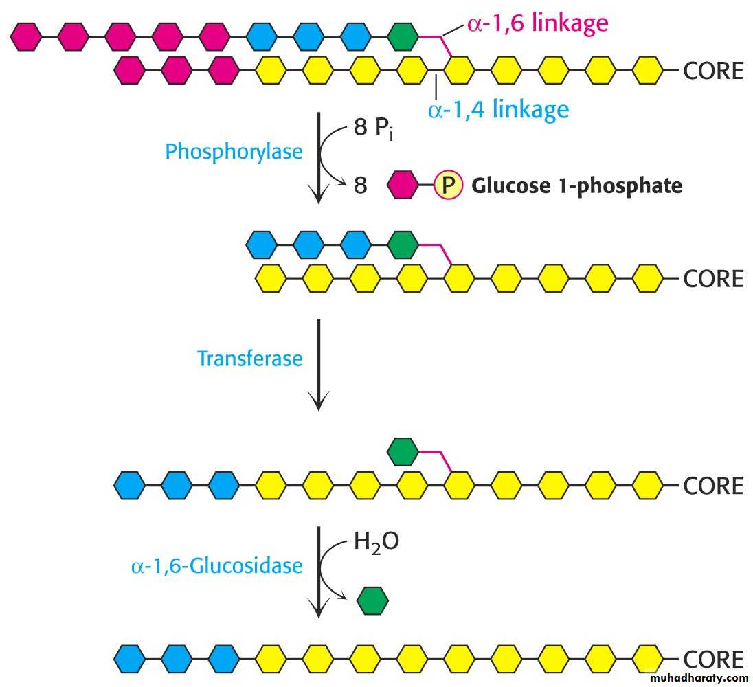 1- In eukaryotes the transferase activity and the α-1,6-glucosidase activity are within one bifunctional protein.