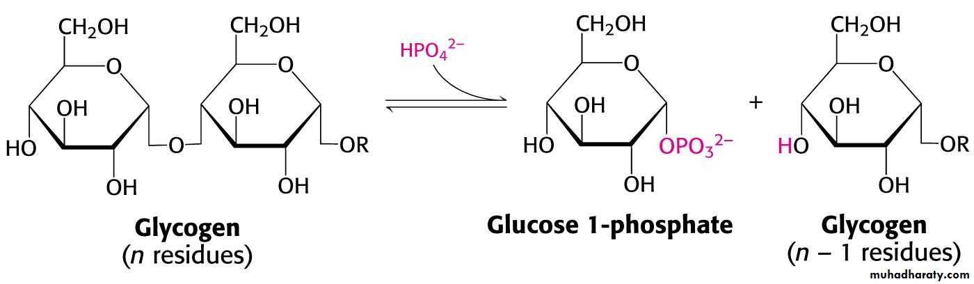 3- Degradation: glucogenn + Pi → Glycogenn-1 + glucose 1-phosphate.