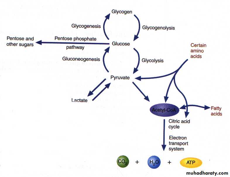 1- Glycolysis: Oxidation of glucose to pyruvate (aerobic state) or lactate (anaerobic state).