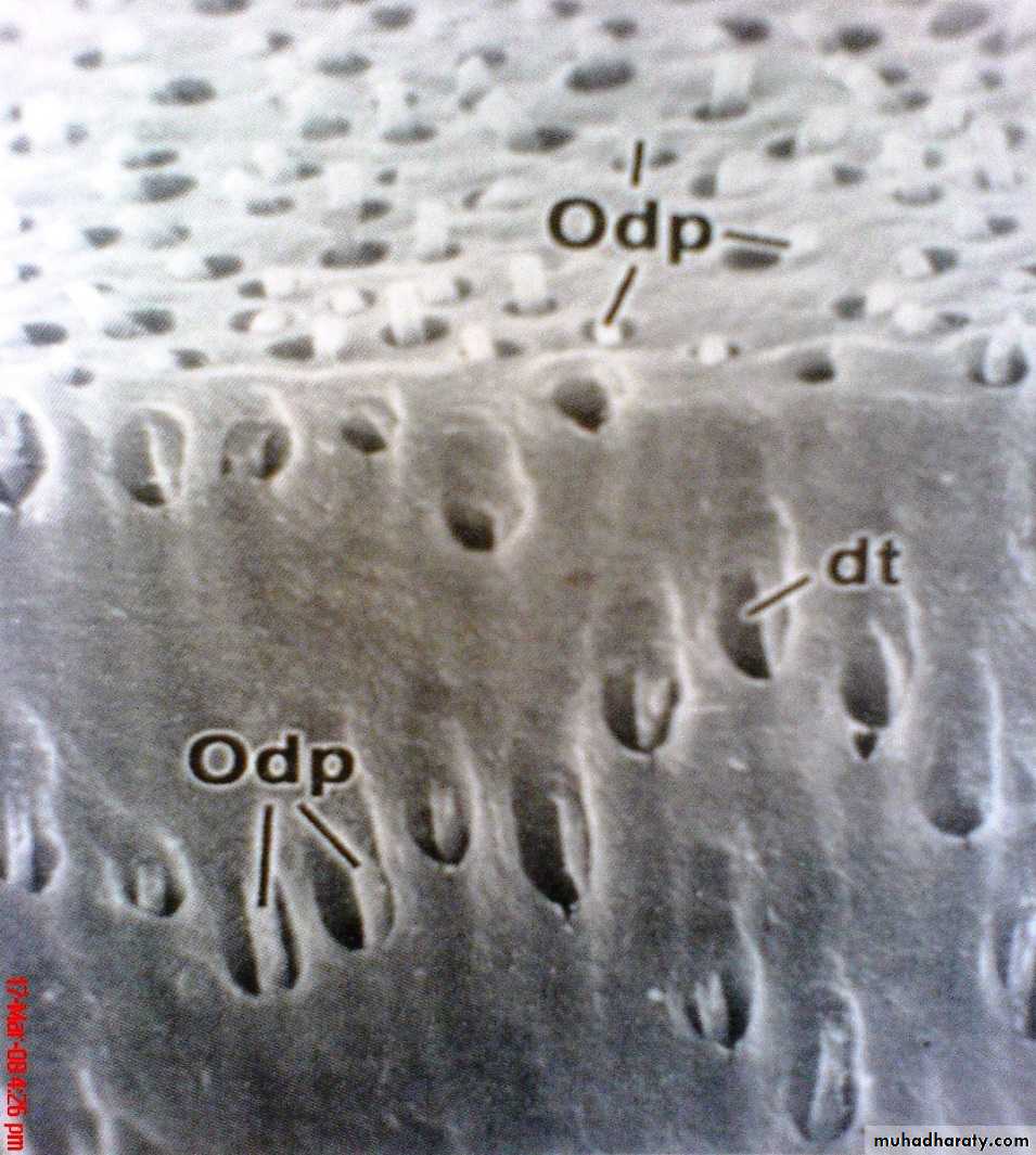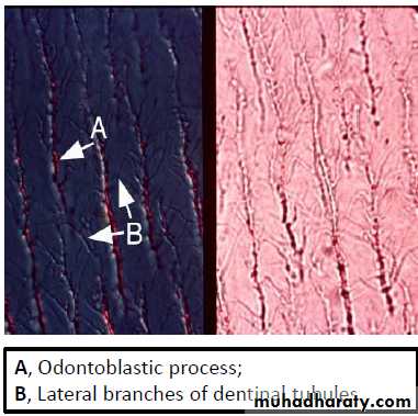 • As a living tissue, it contains within its tubules the process of specialized cells (odontoblasts ). The odontoblastic processes are Cytoplasmic extensions of odontoblasts , have numerous side branches that exist in the canaliculi or microtubules (lateral branches of the dentinal tubules)