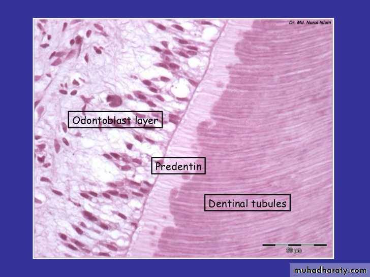 • Predentin is the first deposited layer of un-mineralized matrix of dentin (immature uncalcified dentin consisting chiefly of fibrils )Incremental growth line