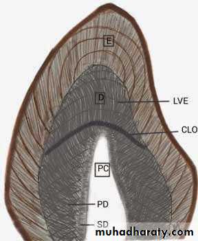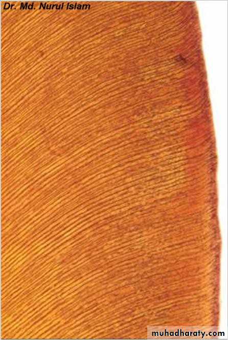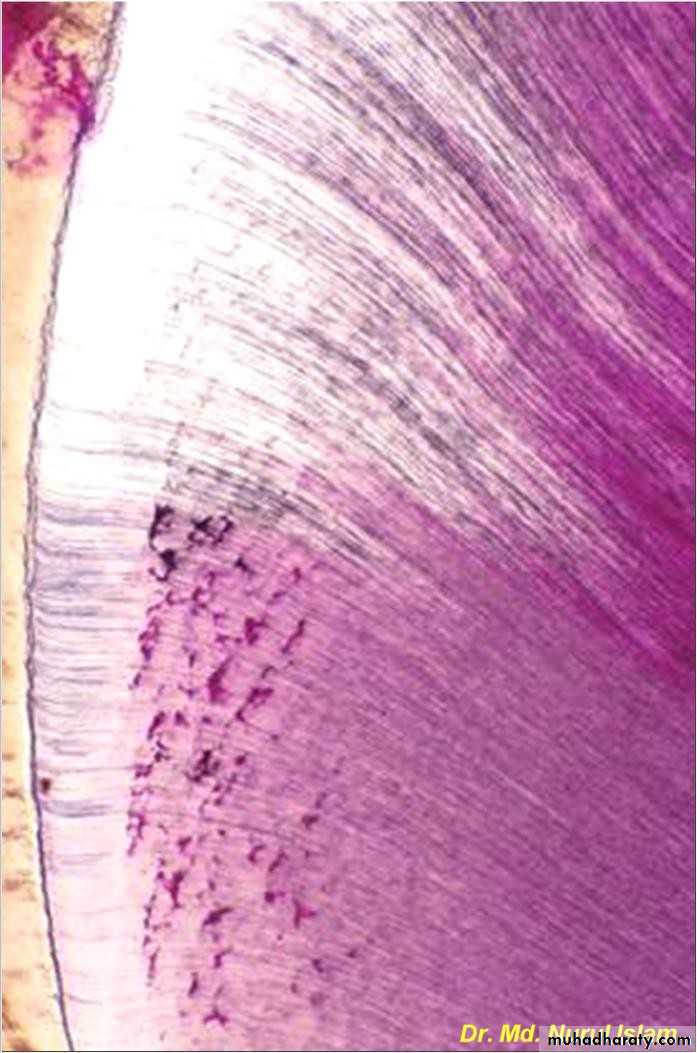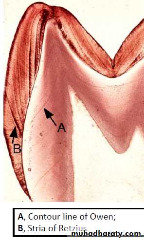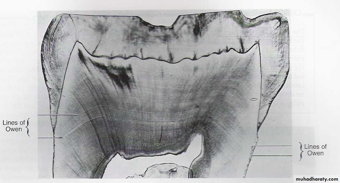Occasionally, some of them are accentuated because of disturbance in the matrix& mineralization. Such lines seen in ground section& known as CONTOUR LINES OF OWEN which represent hypocalcified bands.