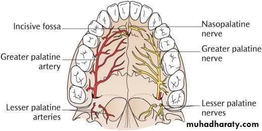 • Sphenopalatine artery (Nasopalatine artery is the terminal branch of the Maxillary artery), supply hard palate anterior to canines.