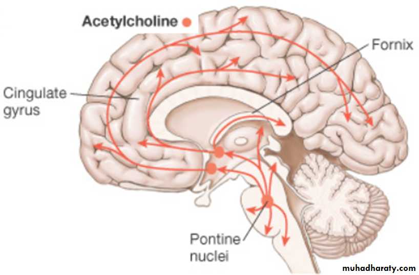 4. The gigantocellular neurons of the reticular excitatory area and the acetylcholine system.Fibers from gigantocellular neurons (the giant cells) in the reticular excitatory area of the pons and mesencephalon divide immediately into two branches, one passing upward to the higher levels of the brain and the other passing downward into the spinal cord. The neurohormone secreted at their terminals is acetylcholine. In most places, the acetylcholine functions as an excitatory neurotransmitter. Activation of these acetylcholine neurons leads to an acutely awake and excited nervous system. Cholinergic neurons in the nucleus basalis of Meynert, a forebrain structure, are involved in the pathogenesis of Alzheimer’s disease.