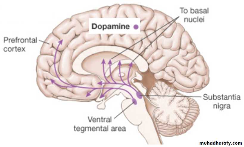 The dopamine is believed to act as an inhibitory transmitter in the basal ganglia, but in other areas of the brain it is possibly excitatory. Dopaminergic neurons play an important role in the brain’s reward system. The reward system is short circuited by addictive drugs, including cocaine, amphetamines, alcohol, nicotine, and opiates, which all increase dopaminergic transmission in the nucleus accumbens.