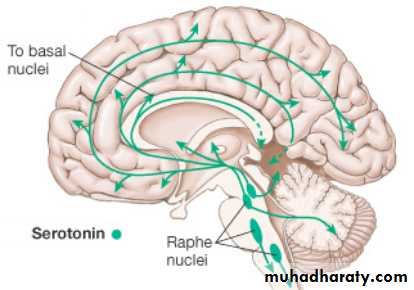 it send fibers into the diencephalon, cerebral cortex, spinal cord. The serotonin secreted at the spinal cord has the ability to suppress pain. The serotonin released in the diencephalon and cerebrum plays an essential role in the control of wakefulness and sleep-wake cycles and to the control of mood and emotions.