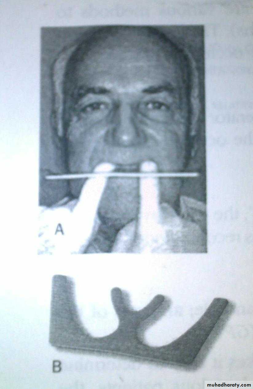 Instruct the patient to stand erect and open the jaws wide until strain is felt in the muscles.When the opening becomes uncomfortable, ask him to close slowly until the jaws reach a comfortable relaxed position.