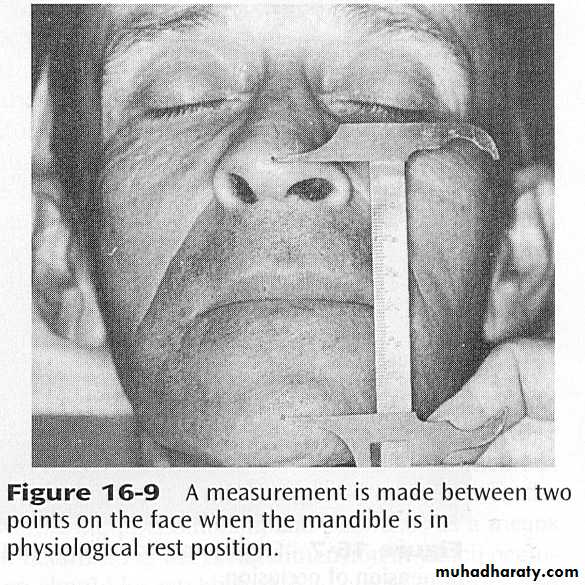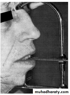 Measurement of a fixed landmark of the face by a special scale called the sorenson profile scale. The Sorenson Profile Scale measurement was taken by placing the nasion locator of the instrument firmly in the depression at the bridge of the nose and raising the chin seat until it lightly touched the most inferior and anterior border of the chin. Or by using Willis bite gauge which is designed to measure the distance from the pupil of the eye to the rima oris and the distance from the nasal spine to lower border of the mandible when measurement is equal the jaw at rest.Methods of recording the occlusal vertical dimension (mechanical methods):