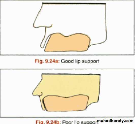 Properly contoured maxillary occlusal rim is inserted in the patient’s mouth and following are assessedLip support: Upper lip should just supported enough.