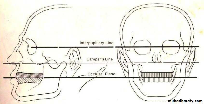 Orientation of occlusal planeThe occlusal plane is defined as imaginary plane established by the incisal and occlusal surfaces of the teeth".