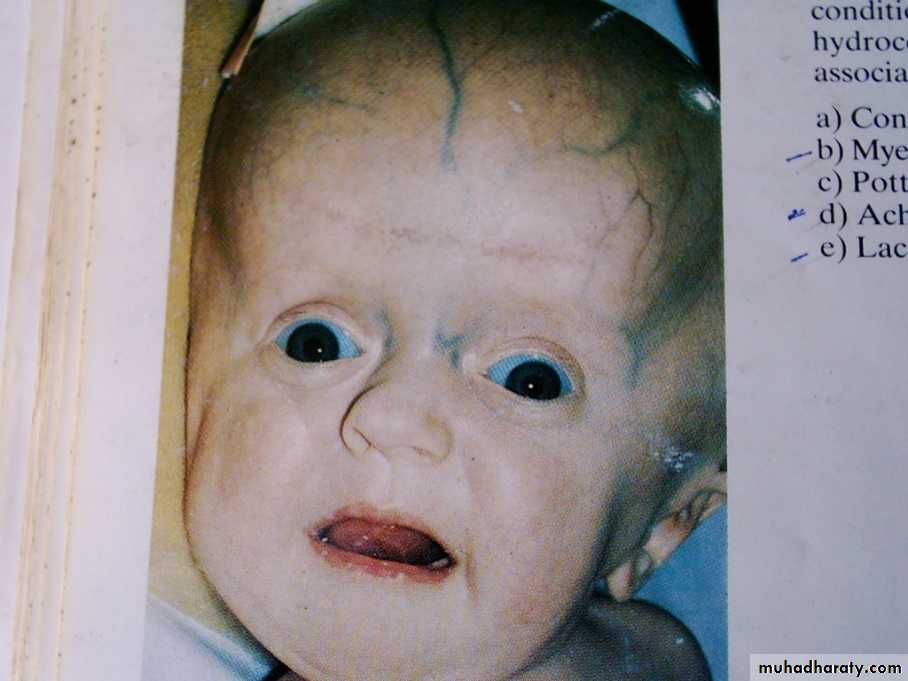 Sign: bulging fontanel , suture diastasis , distended scalp veins , sun set eyes , rapid growth of OFC.