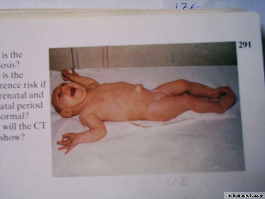 The cortical activity is intact if the baby is bright eyed able to follow and try to smile but is unable to move .