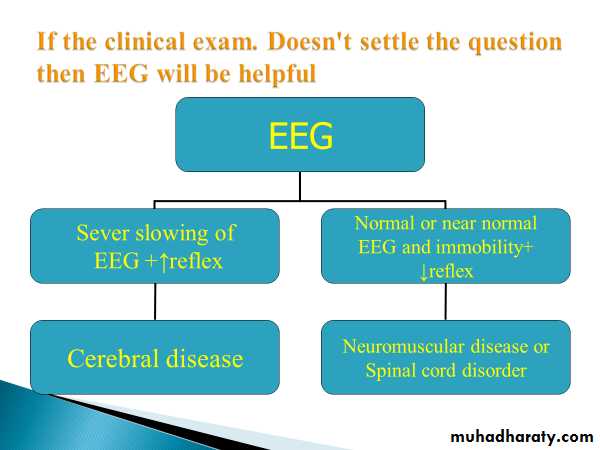 The 1st step in evaluations of an infant who doesn't move spontaneously or in response to stimuli is to determine whether awareness is intact ?