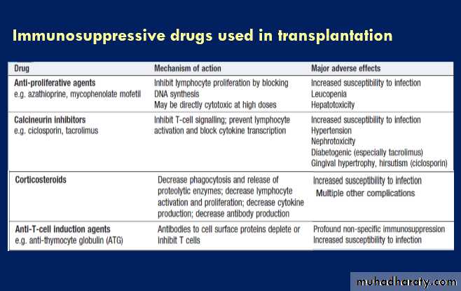 two or more immunosuppressive drugs are used in synergistic combinations in order to minimise drug sideeffects (Box). The major complications of long-term