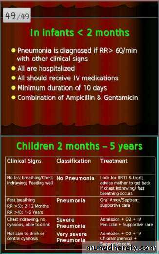 3) In young infants the cut off point for fast breathing is 60 breaths per minute. Any pneumonia in young infants is considered to be severe.