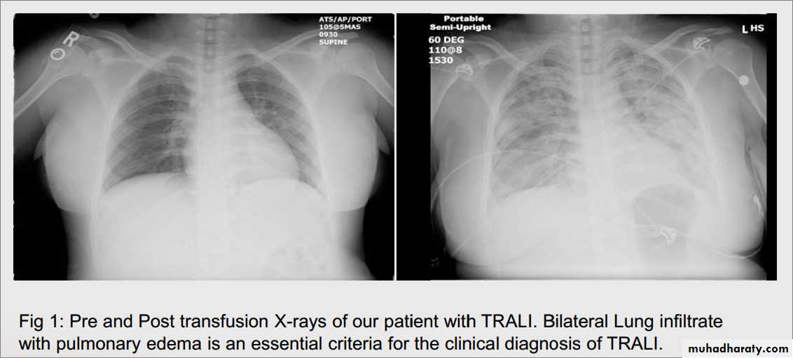 (CVP IS NORMAL )Transfusion-related acute lung injury (TRALI) is the leading cause of transfusion-related mortality. It is characterized by the development of acute lung injury within 6 hours of transfusion of erythrocytes, platelets, or FFP. TRALI is mediated by initial priming of neutrophils in the recipient's lung parenchyma (endothelial damage, for example) followed by their activation by anti-HLA and antineutrophil antibodies present in donor plasma. Signs and symptoms escalate quickly and include dyspnea,COUGH , hypoxia, fever, chills, and hypotension. Chest radiograph reveals diffuse bilateral pulmonary infiltratrate.