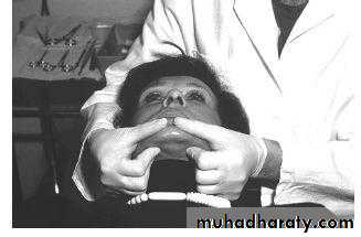 • Assist the patient to protrude and retrude the mandible repeatedly with the operator holding the finger lightly against the chin.