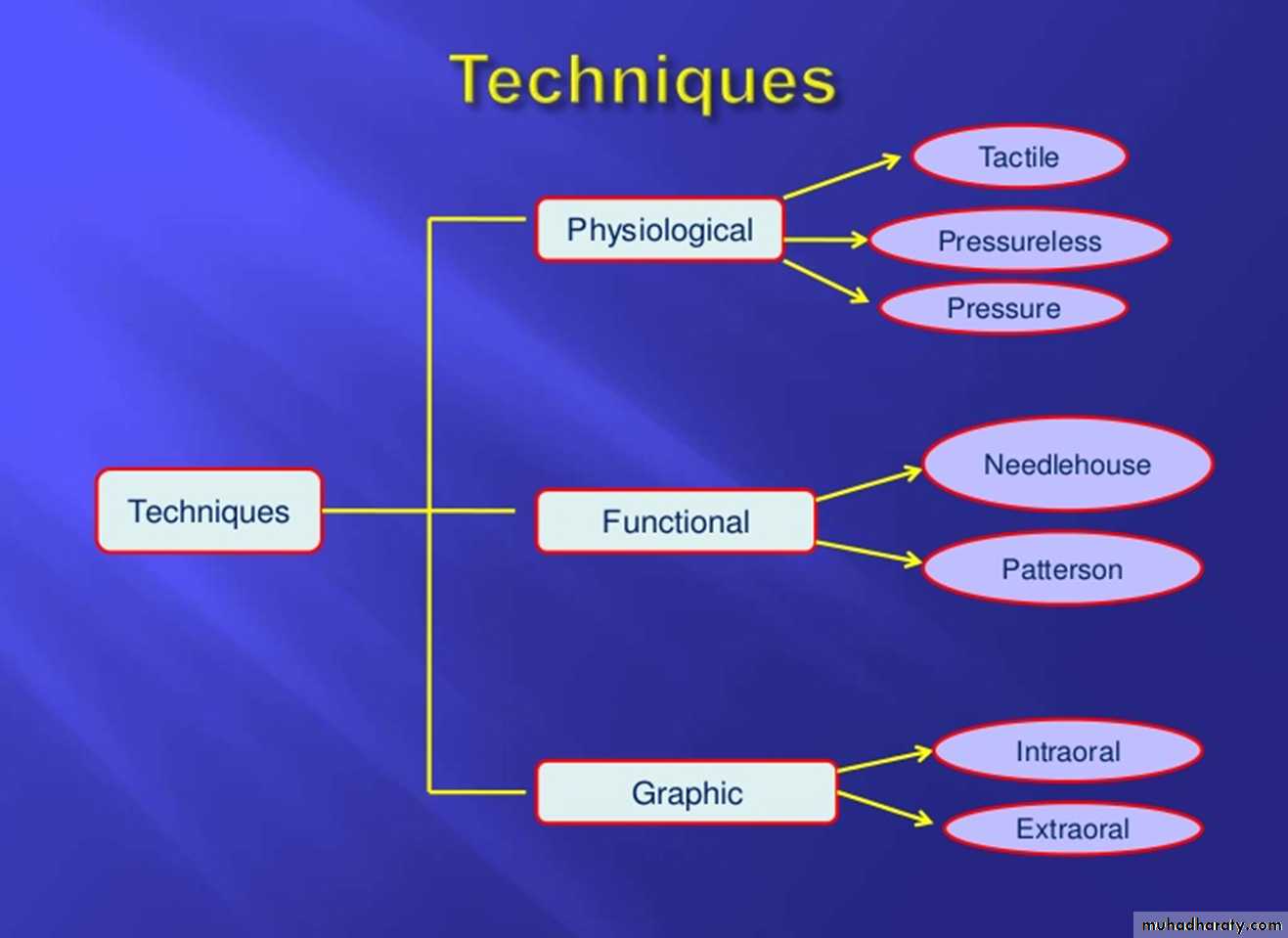 The graphic methods are either intraoral or extraoral depending upon the placement of the recording device. The extraoral is preferable to the intraoral tracing, because the extraoral is more accurate, more visible, and larger in comparing with the intraoral tracing.