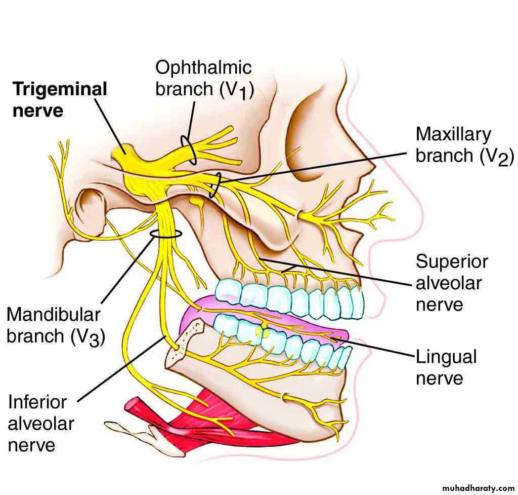 The trigeminal nerve is the largest cranial nerve. It leaves the anterior aspect of the pons as a small motor root and a large sensory root, and it passes forward, out of the posterior cranial fossa, to reach the apex of the petrous part of the temporal bone in the middle cranial fossa. Here, the large sensory root expands to form the trigeminal ganglion. The trigeminal ganglion lies within a pouch of dura mater called the trigeminal cave. The motor root of the trigeminal nerve is situated below the sensory ganglion and is completely separate from it. The ophthalmic (VI), maxillary (V2), and mandibular (V3) nerves arise from the anterior border of the ganglion.Ophthalmic Nerve (V1) :