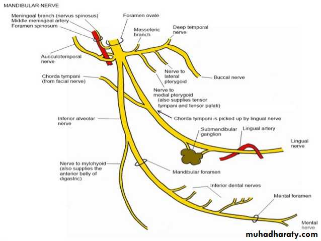 The maxillary nerve arises from the trigeminal ganglion in the middle cranial fossa. It Passes forward in the lateral wall of the cavernous sinus and leaves the skull through the foramen rotendum and crosses the pterygopalatine fossa to enter the orbit through the inferior orbital fissure . It then continues as the infraorbital nerve in the infraorbital groove, and it emerges on the face through the infraorbital foramen. It gives sensory fibers to the skill of the face and the side of the nose.Mandibular Nerve (V3)