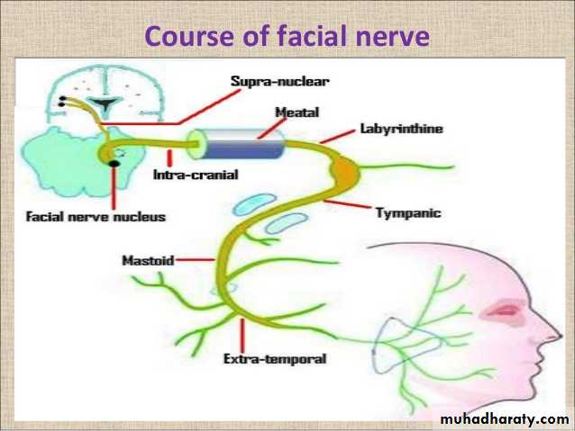 The facial nerve has a motor root and a sensory root. The nerve emerges on the anterior surface of the hindbrain between the pons and the medulla oblongata. The roots pass laterally in the posterior cranial fossa with the vestibulocochlear nerve and enter the internal acoustic meatus in the petrous part of the temporal bone . At the bottom of the meatus, the nerve enters the facial canal that runs laterally through the inner ear..On reaching the medial wall of the middle ear (tympanic cavity), the nerve swells to form the sensory geniculate ganglion. The nerve then bends sharply backward above the promontory and at the posterior wall of the middle ear bends down on the medial side of the aditus of the mastoid antrum . The nerve descends behind the and it emerges from the temporal bone through the stylomastoid foramen. The facial nerve now passes forward through the parotid gland to its distribution