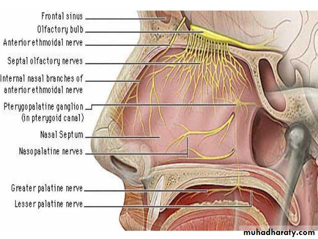 The olfactory nerves arise from olfactory receptor nerve cells in the olfactory mucous membrane. The olfactory mucous membrane is situated in the upper part of the nasal cavity above the level of the superior concha. Bundles of these olfactory nerve fibers pass through the openings of the cribriform plate of the ethmoid bone to enter the olfactory bulb in the cranial cavity. The olfactory bulb is connected to the olfactory area of the cerebral cortex by the olfactory tract.