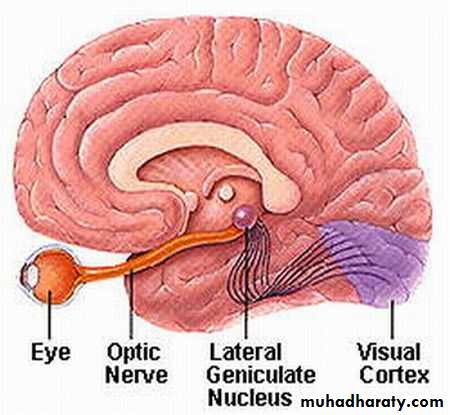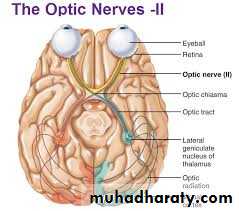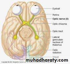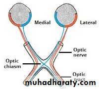 The optic nerve is composed of the axons of cells of the ganglionic layer of the retina. The optic nerve emerges from the back of the eyeball and leaves the orbital cavity through the optic canal to enter the cranial cavity. The optic nerve then unites with the optic nerve of the opposite side to form the optic chiasma .In the chiasma, the fibers from the medial half of each retina cross the midline and enter the optic tract of the opposite side, whereas the fibers from the lateral half of each retina pass posteriorly in the optic tract of the same side. Most of the fibers of the optic tract terminate by synapsing with nerve cells in the lateral geniculate body. A few fibers pass to the perirectal nucleus and the superior colliculus and are concerned with light reflexes. The axons of the nerve cells of the lateral geniculate body pass posteriorly as the optic radiation and terminate in the visual cortex of the cerebral hemisphere.