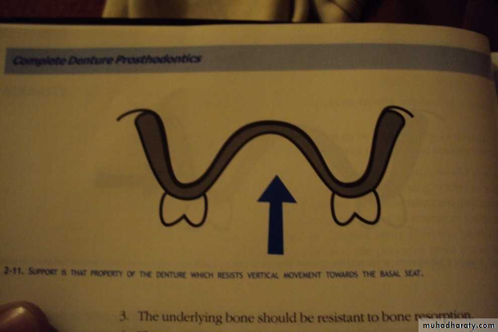 It is the resistance to vertical forces applied in a direction toward the basal seat, therefor, the greater the amount of area covered the greater the support.When the natural teeth are missing ,the alveolar ridge & their covering of mucosal tissue become the supporting elements.