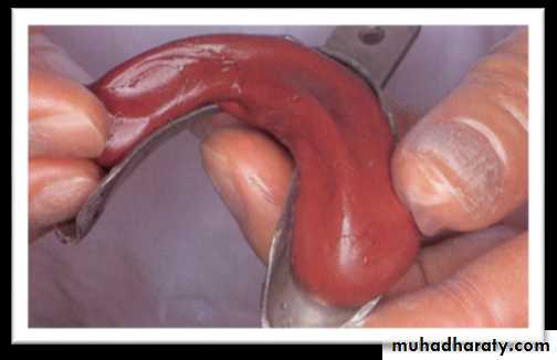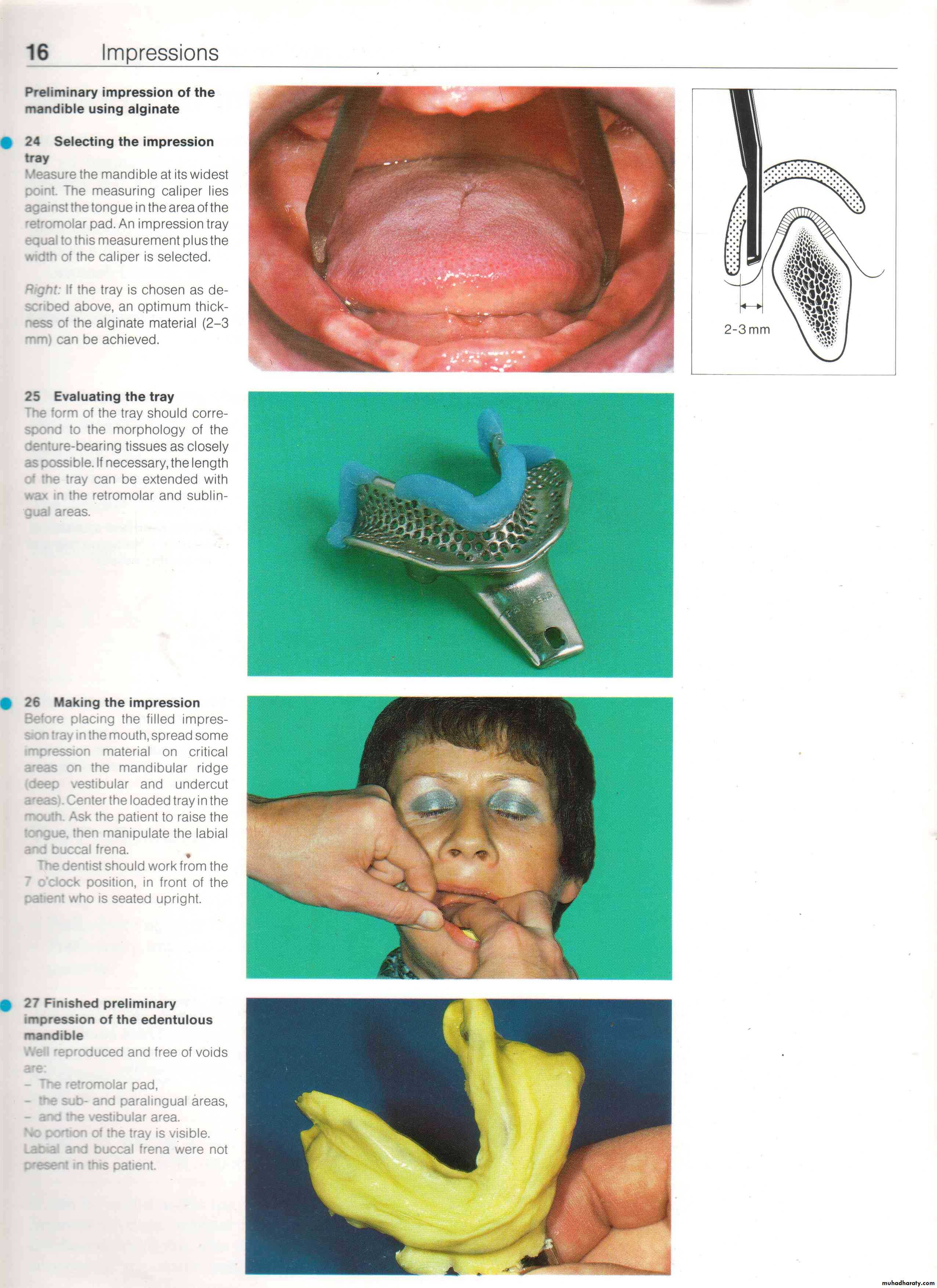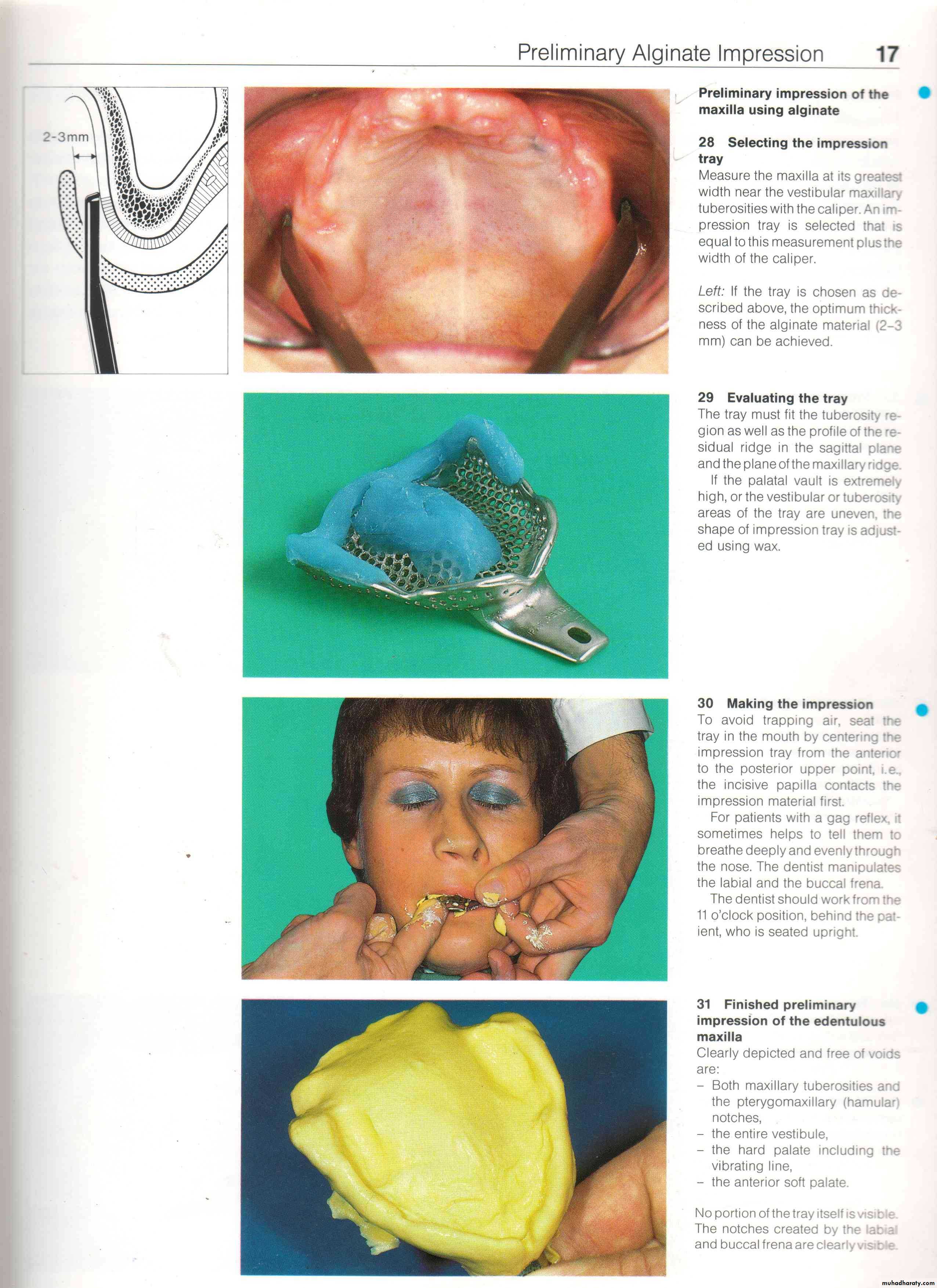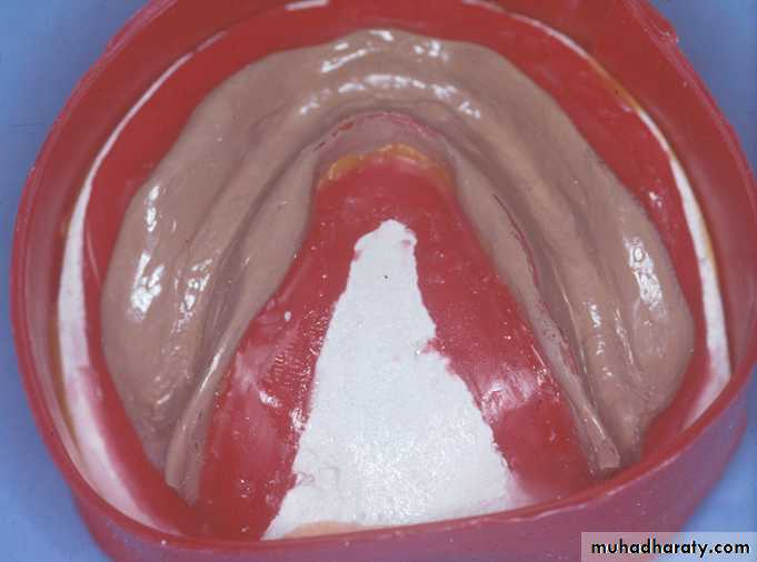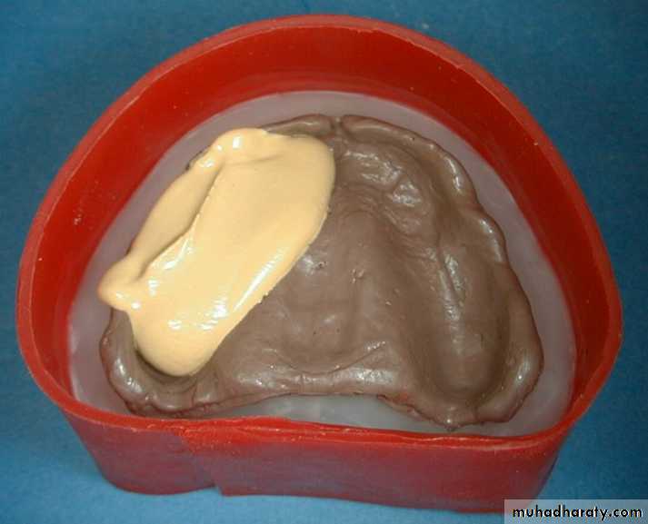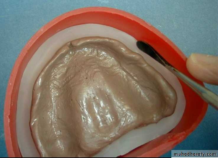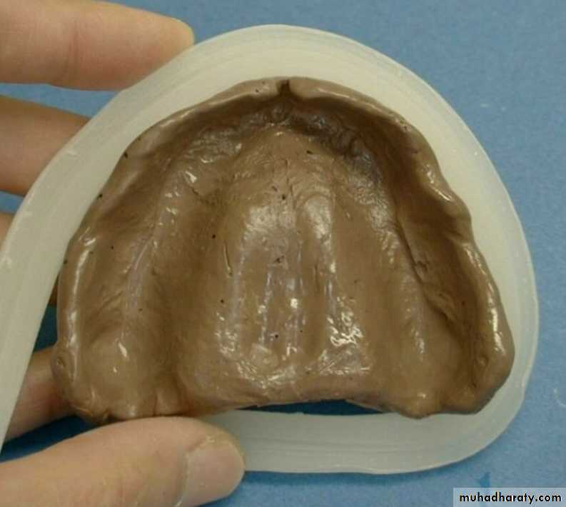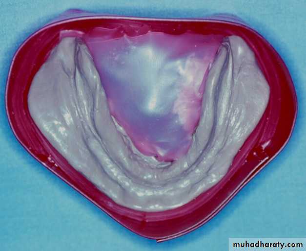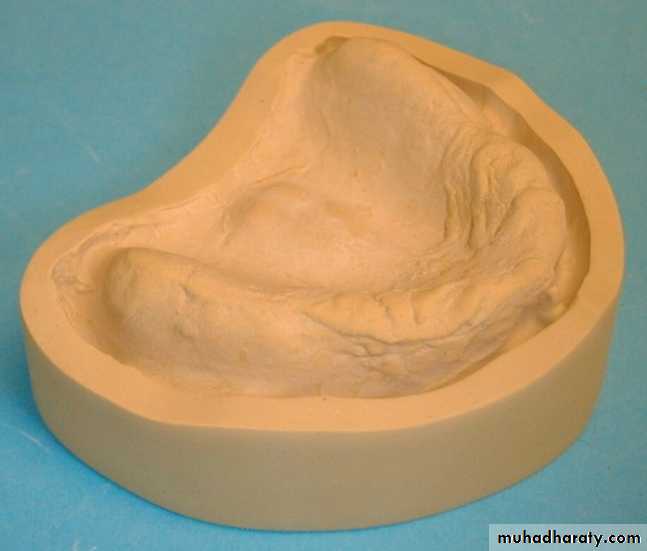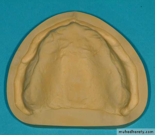The negative likeness of the oral tissues made for the prepare of diagnosis, treatment planning, or the fabrication of tray. It’s the first impression made for the patient and from which the study cast was produced. This impression is obtained by stock tray.For upper stock tray, the posterior border of the tray should cover the maxillary tuberosity and hamular notch, anteriorly should include the antero-alveolar ridge