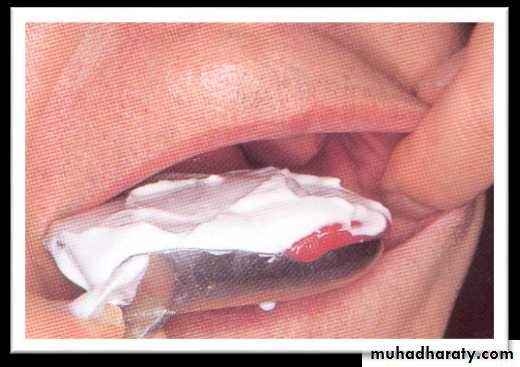 3. The loaded tray is positioned in the mouth. Tray to be rotated into the mouth and seated first at the back of the mouth.