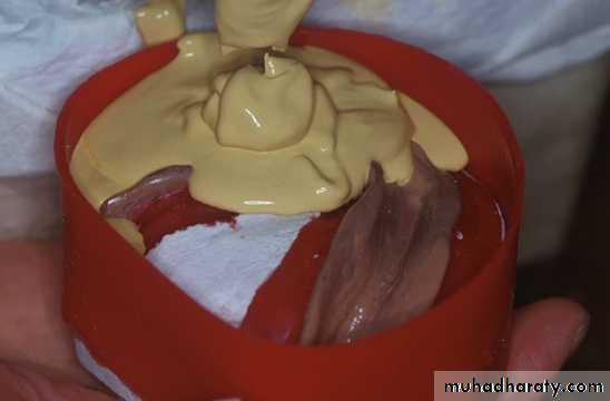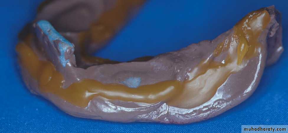 a sheet of wax can be used to fill the tongue space in the lower impression that is sealed to lingual border of the impression and should be located just below the lingual border of the impression.4. Artificial stone