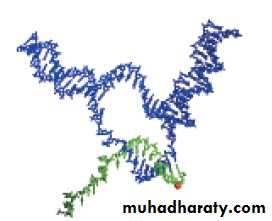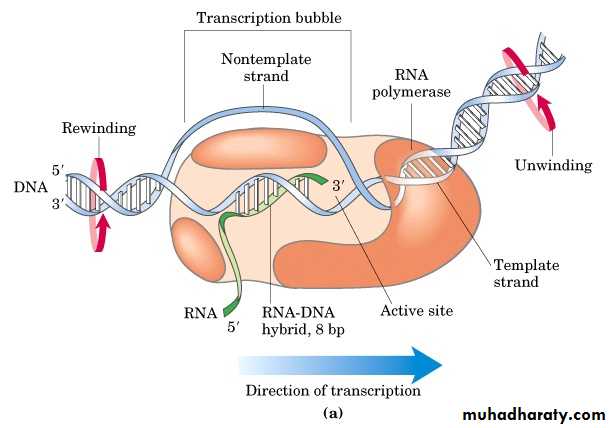 • The 3 segment of the nascent RNA hybridizes with the DNA template, and its 5 end extends out the transcription bubble as the synthesis is processing.