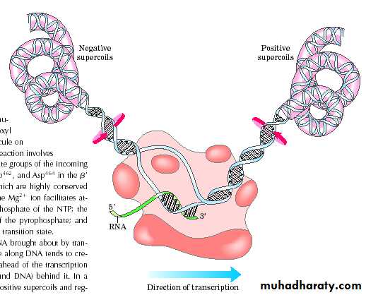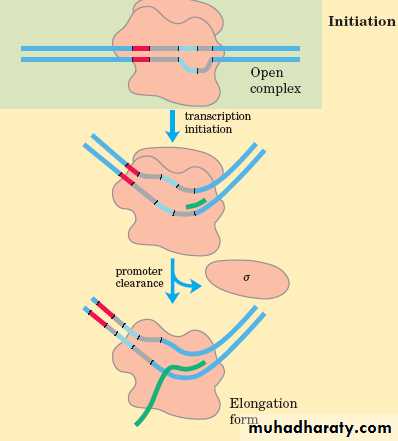 • The release of the subunit causes the conformational change of the core enzyme. The core enzyme slides on the DNA template toward the end.• Free NTPs are added sequentially to the 3 -OH of the nascent RNA strand.
