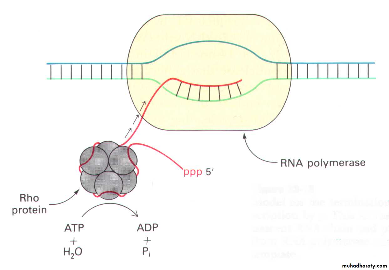 • The RNA-pol stops moving on the DNA template. The RNA transcript falls off from the transcription complex.• The termination occurs in either -dependent or -independent manner.