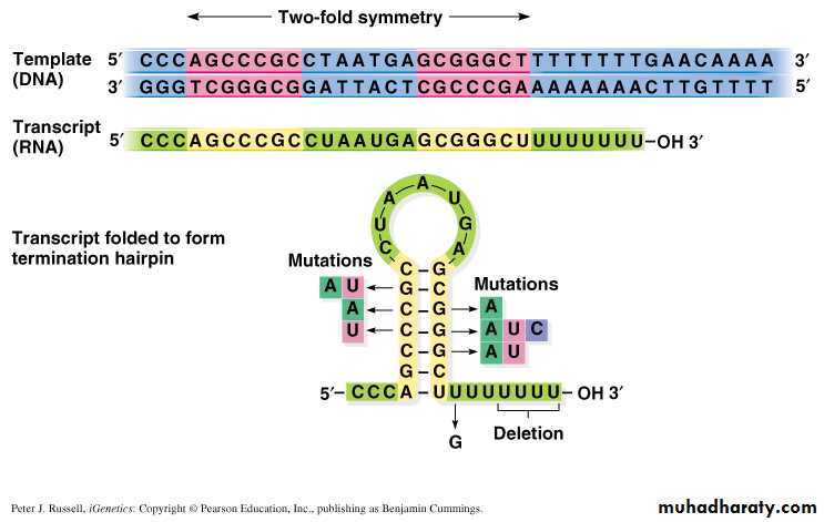 • The termination signal ( Palindrome) is a stretch of 30-40 nucleotides on the RNA transcript, consisting of many GC followed by a series of A.• The sequence specificity of this nascent RNA transcript will form particular stem-loop structures to terminate the transcription.