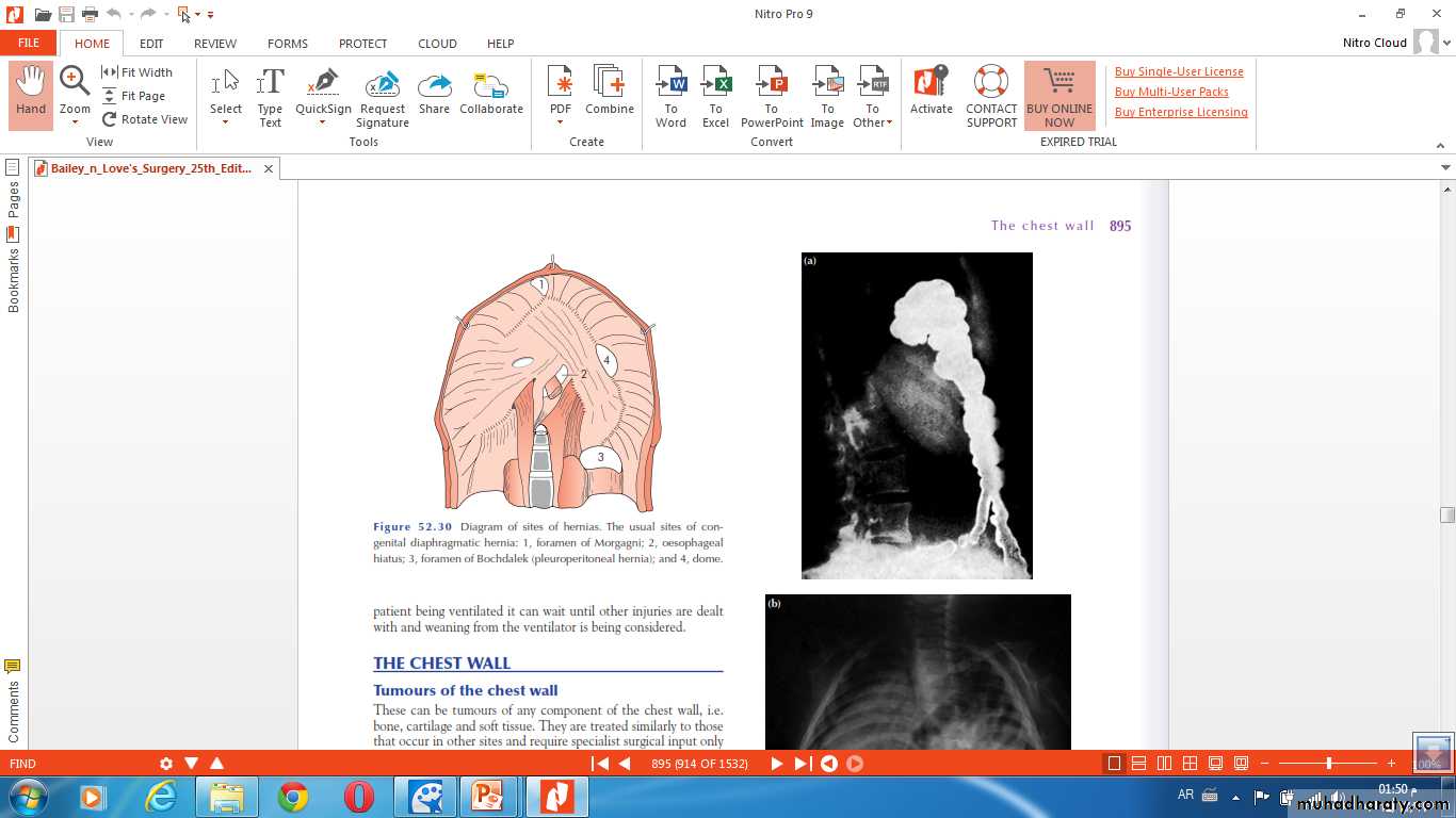 • SURGERY:delayed repairtransabdominal X transthoracicsubcostal incisionReduction of hernial contents10 closureProsthetic meshventral hernia for big defectsFetal intervention: 1. Tracheal occlusion.2. Prenatal steroid.3. Intrauterine surgical repair.