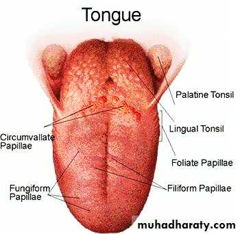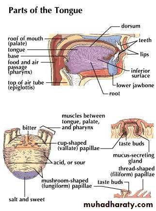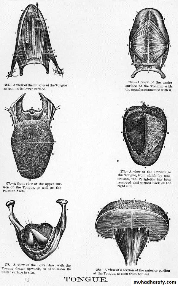 a mucous membrane bag stuffed with muscles. The tongue bluges upwards from the floor of the mouth, and its posterior part forms the anterior wall of the oral part of the pharynx. It consists of mass of striated muscles interspersed with little fat & numerous glands, especially in the posterior part.
