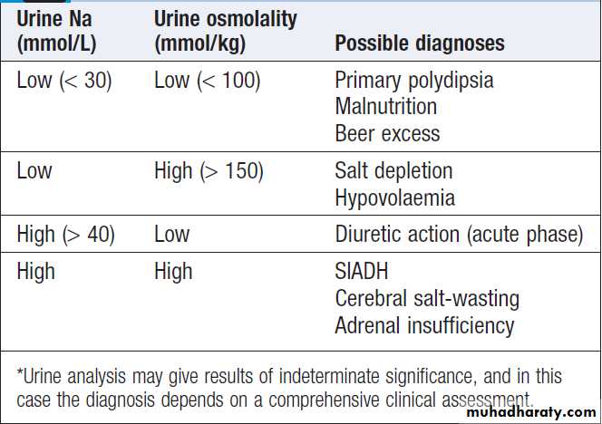 Since the kidney maintains the constancy of body fluids by adjusting urine volume and composition, it is frequently helpful to obtain a sample of urine (‘spot’ specimen or 24-hour collection) at the time of blood analysis. An example of the use of urine biochemistry is given for the differential diagnosis of hyponatraemia in Box.